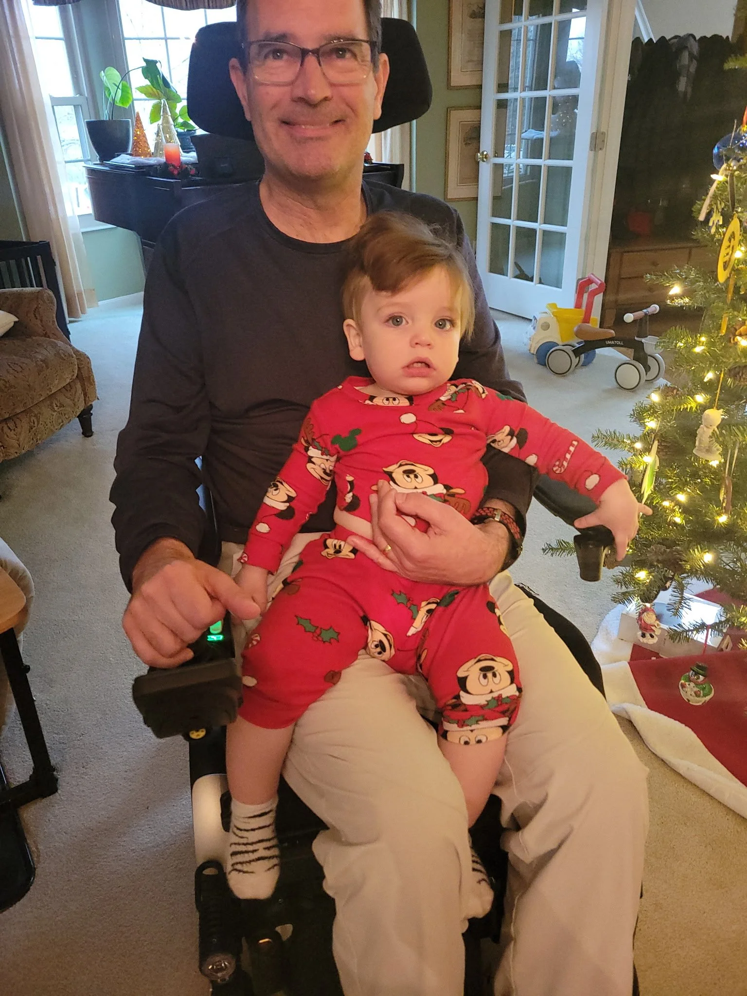 John shared that, from an ALS perspective, he has experienced a decline since the summer of 2024. He is now reliant on a wheelchair full-time, and his speech has become more difficult. Nevertheless, his positive attitude and love for life remain undiminished. When reflecting on the past year and a half, one highlight for him has been becoming a grandfather for the first time, to a grandson. He feels incredibly fortunate that they live just ten minutes away, allowing them to see the toddler frequently, and he is excited about another grandchild (a girl) arriving in March. John and his wife Ann have also enjoyed several trips, including visits to Lake Tahoe, various cruises, and North Carolina.